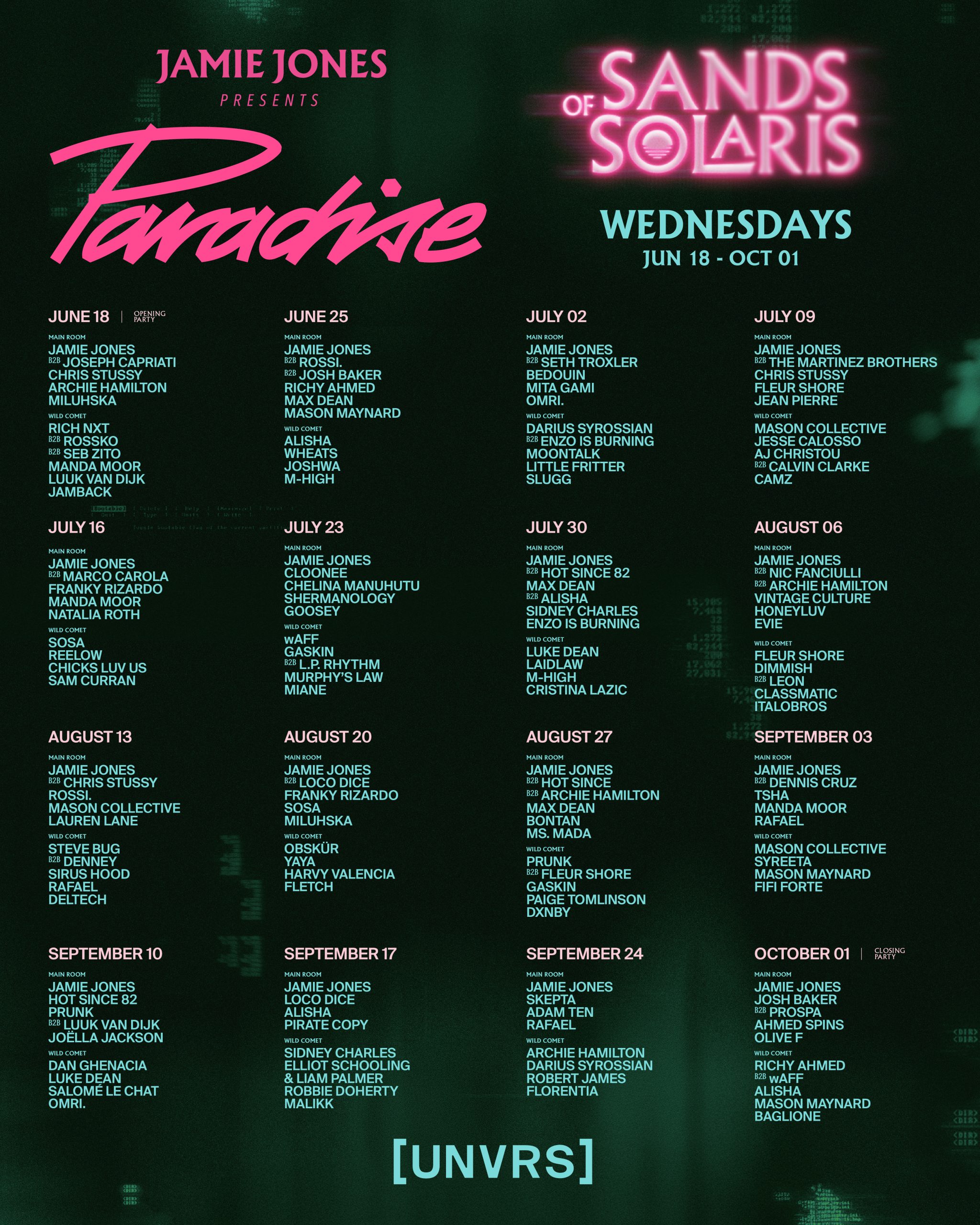 El 25 de junio Paradise seguirá desarrollando su proyecto con una apuesta clara por la calidad y con un b2b incendiario: Jamie Jones B2B Rossi. B2B Josh Baker, Richy Ahmed, Max Dean, Mason Maynard, Alisha, Wheats, Joshwa y M-High.