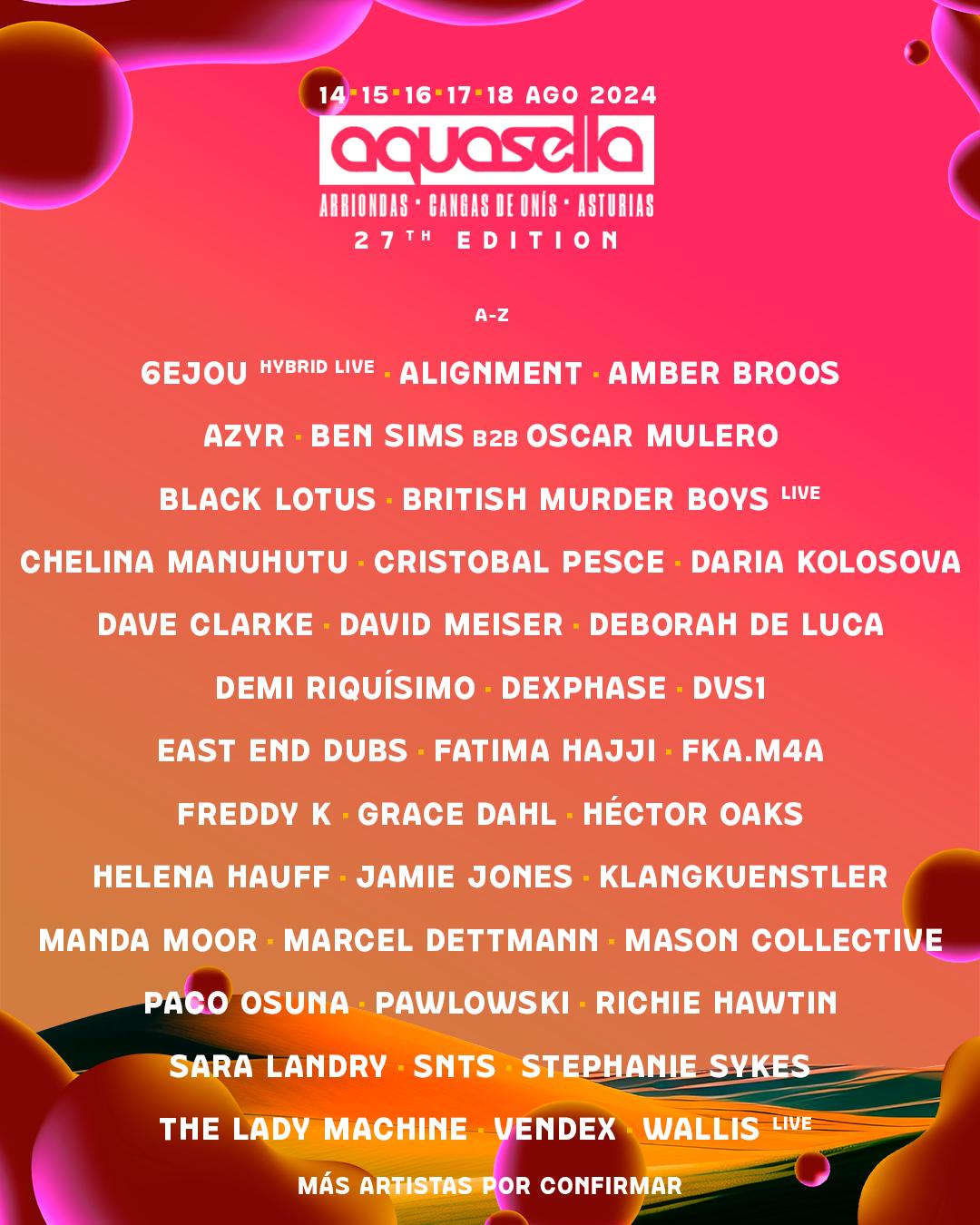 Aquasella se alista para su vigésimo séptima entrega como uno de los eventos más duraderos en el circuito de festivales nacional. Una edición sumamente anticipada después de establecer nuevos registros en la pasada entrega en Agosto de 2023. El festival ha ido sumando nombres destacados tanto a nivel nacional como internacional, conformando un cartel completo con figuras emblemáticas en la historia del evento como Richie Hawtin, Jamie Jones, Marcel Dettman, Paco Osuna, Dave Clarke, Fátima Hajji, Óscar Mulero, Ben Sims o British Murder Boys. Además, incluye cabezas de cartel que harán su debut en el prado en 2024 como Sara Landry, Debora de Luca o The Lady Machine.