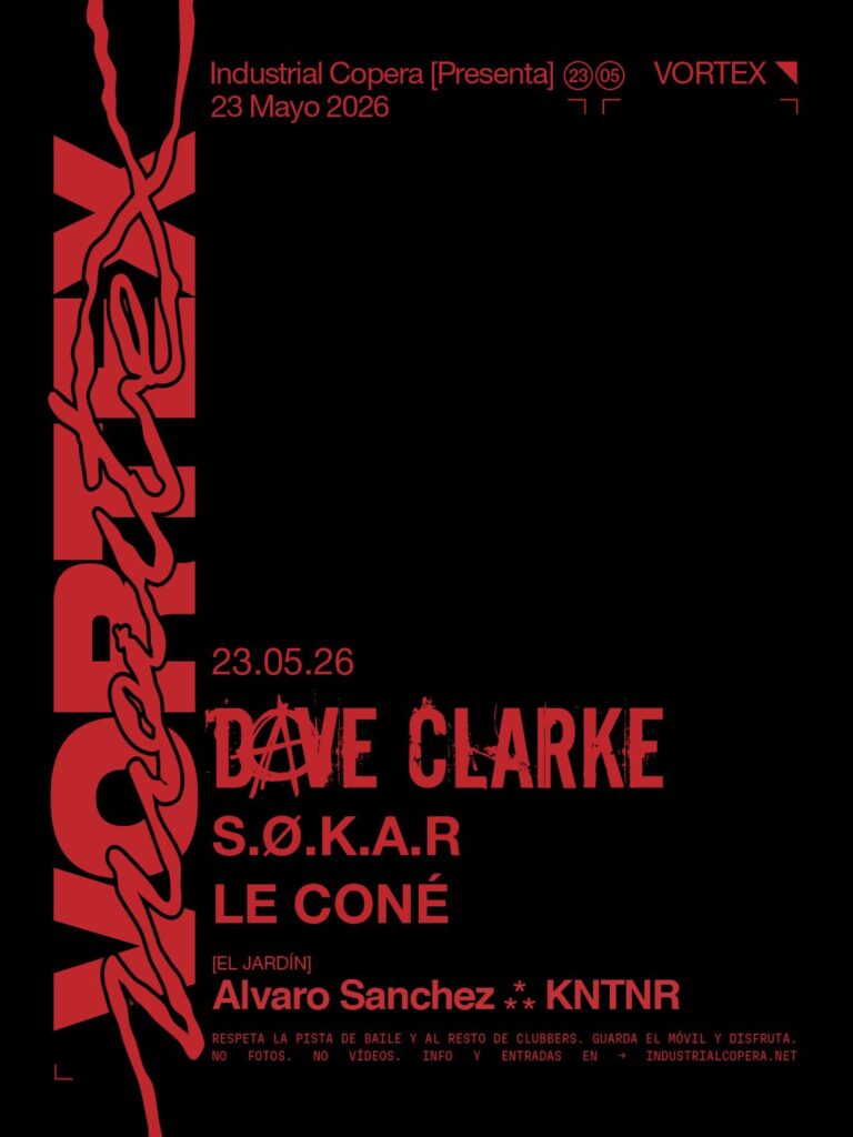 Uno de los conceptos más estimulantes de Industrial Copera es sin duda alguna VORTEX, en esta ocasión estará encabezado por Dave Clarke. Conocido mundialmente como “The Baron of Techno” (apodo otorgado por el legendario John Peel de la BBC), Dave Clarke es una figura clave e influyente en la historia del techno y la música electrónica. DJ, productor, remixer y conductor del icónico programa de radio White Noise, Clarke destaca por su autenticidad, actitud punk y enfoque sin concesiones. Originario de Brighton, Inglaterra, y actualmente establecido en Ámsterdam, Dave Clarke ha marcado generaciones con su sonido inconfundible: techno crudo, electro oscuro y una energía imparable en cada set.