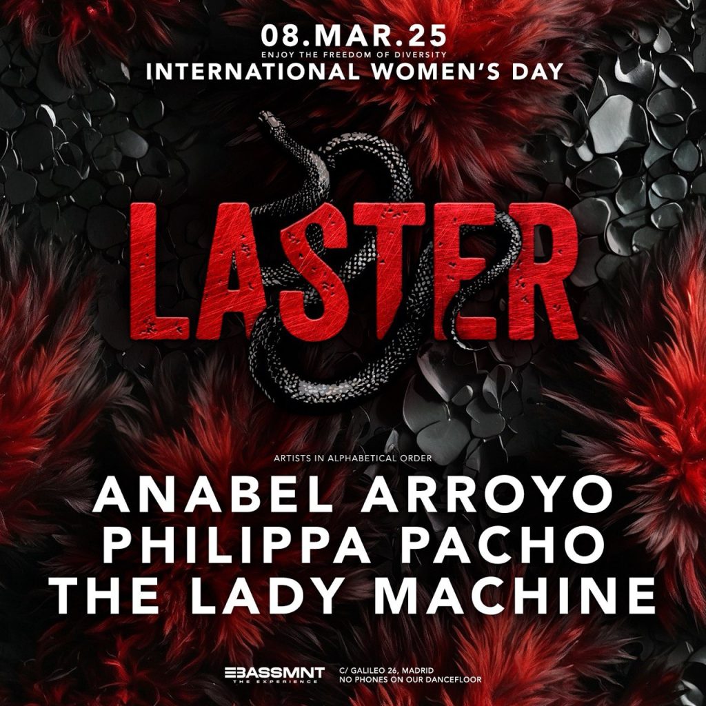 Para el Día Internacional de la Mujer, la fiesta será bajo la luz roja con el primer capítulo de tres de Laster Club este mes. Tres artistas que se identifican con la marca estarán en la cabina: la brasileña The Lady Machine, la residente Anabel Arroyo y la sueca Philipa Pacho, quien hará su debut en The Bassement.